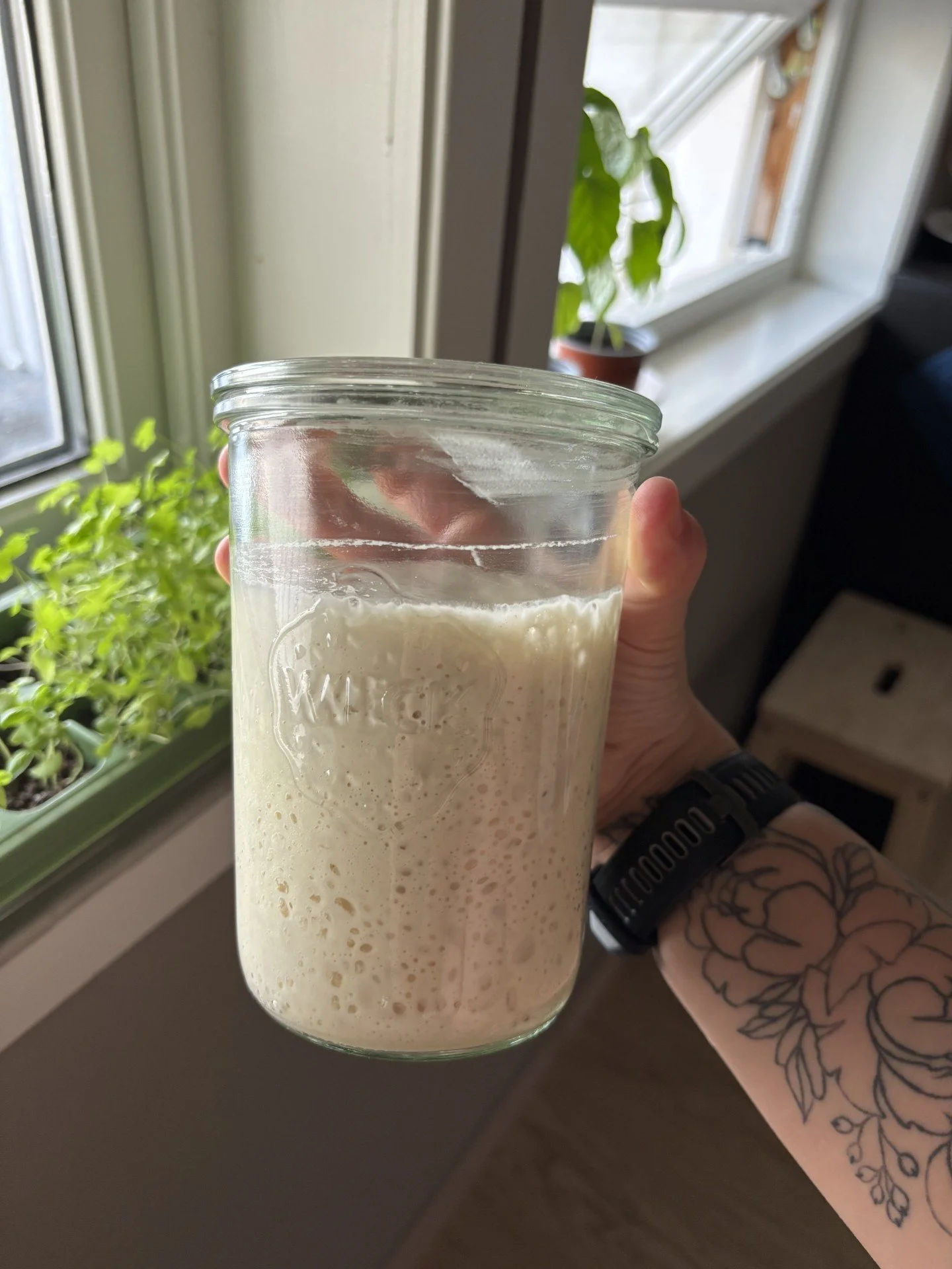 Surdeigen våres har fått navnet Gjærulf og lever i beste velgående på kjøkkenbenken vår. Den mates opp jevnlig og brukes i alt av surdeigsbakst.
